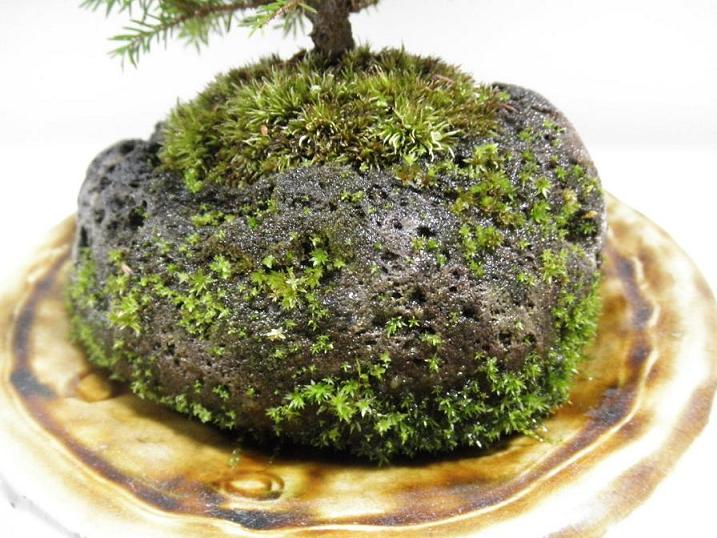 小さな石をくり抜いて植木鉢に利用。軽石のような石なので水はけも良く、また、水の湿り気もたもたれて苔がとても綺麗です。